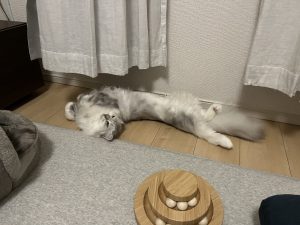 本当はカーペットを敷くのが良いんだろうと思うのですが、暑い夏に冷たいフローリングにぺたぁと寝ている姿を見ると悩ましいです